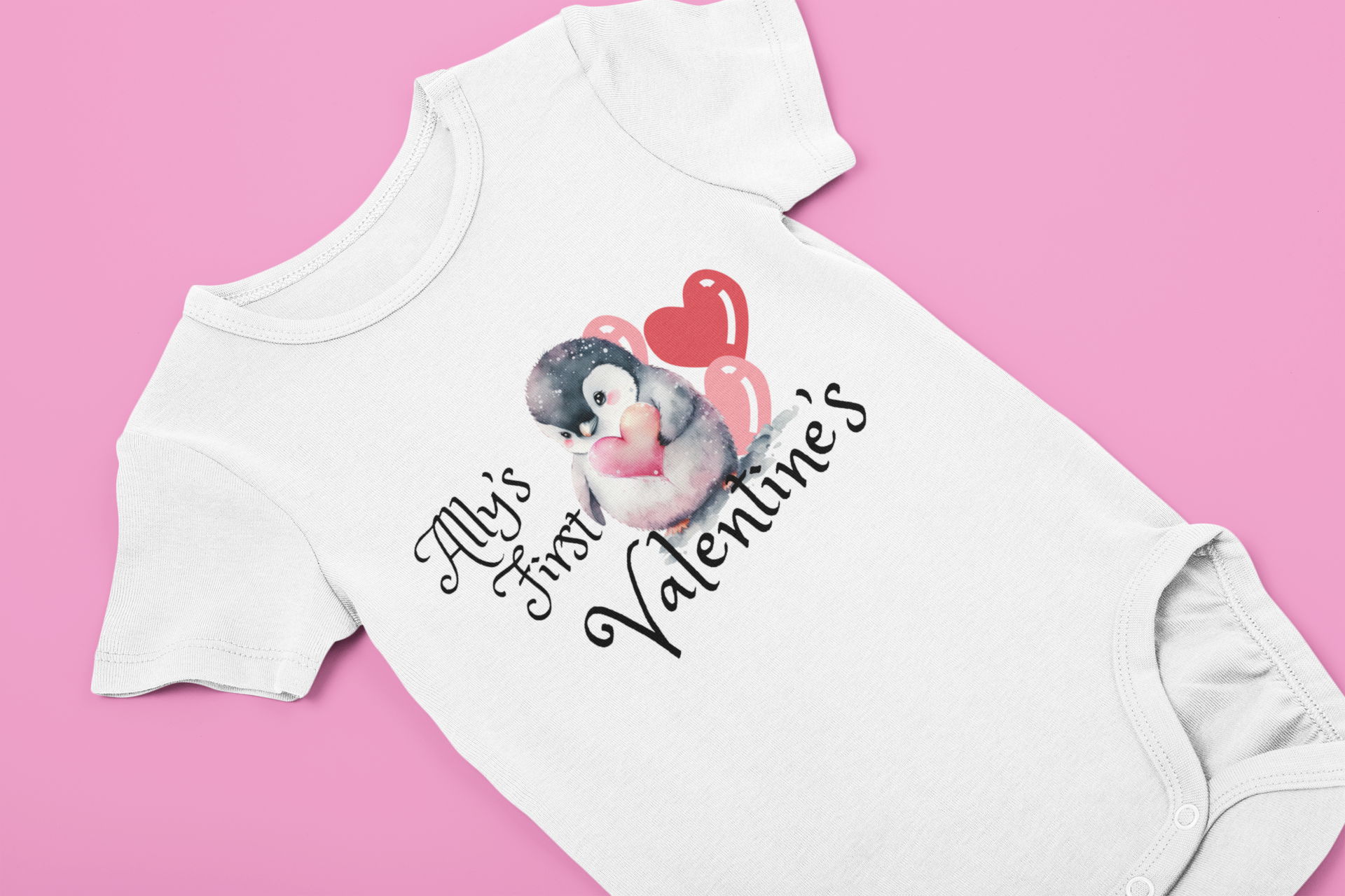 Our “My First Valentine” baby onesie features a sweet watercolor penguin holding a heart, paired with your baby’s name for a keepsake you’ll treasure forever. Made from soft, lightweight polyester, this onesie is perfect for Valentine’s photos, family gatherings, or gifting to new parents.